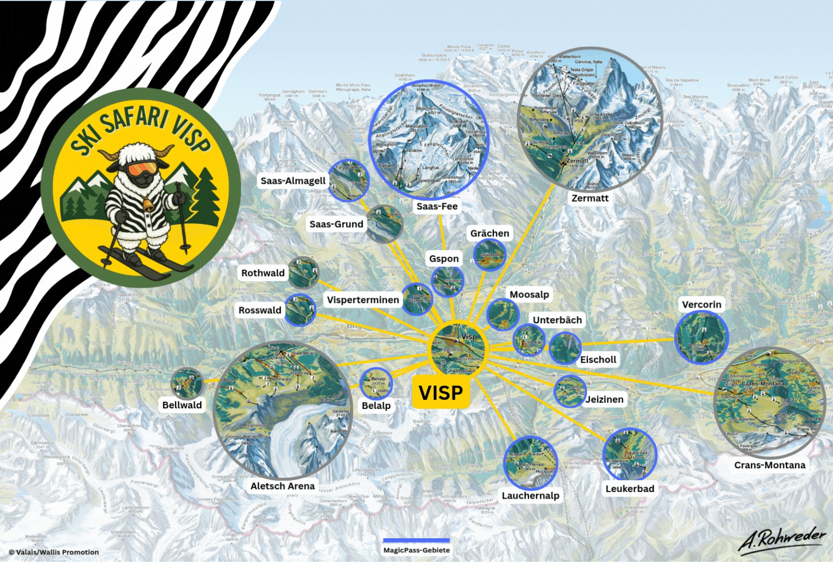 Wer den Winter mag, wird das Wallis lieben! 2.000 km Skipisten und schneesichere Skigebiete. Visp ist der ideale Ausgangspunkt für die diversen Skigebiete. Werde auch du ein Ski-Safarier:in!